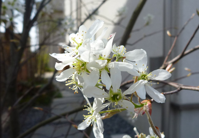 我が家のジューンベリーの花が満開です。白い繊細な花びらで、さくらのようにパッと咲いてパッと散っていきます。6月ごろには赤い美味しい実をたくさんつけてくれます。