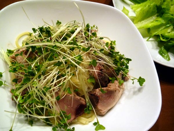 カツオが安いのでカツオのタタキパスタ。塩コショウ、オリーブオイルとレモンとハーブに漬けておいた生のカツオをあぶってタタキにして薄く切り、ニンニクをきかせたペペロンチーノの上に乗せてみました。