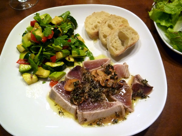 カツオのタタキのカルパッチョ風。やっぱりニンニクとよく合います。