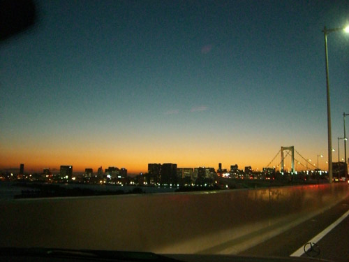 帰りはレインボーブリッジ渋滞。夕焼けが見事で富士山がシルエットになってとてもきれいでした。渋滞のおかげで東京到着が遅れ、クリスのウェルカムパーティーに出席できず、残念。クリスは今日、大阪へ移動日です。