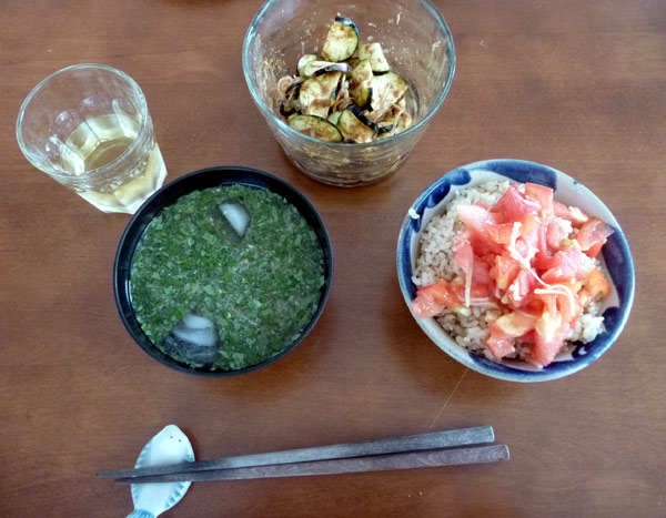 暑い朝の朝ごはん。しょうがトマトのせご飯にモロヘイヤの冷たい味噌汁、茄子の浅ずけです。