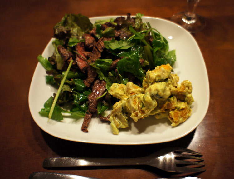 昨夜の晩ご飯はアメリカ産のステーキ肉が少々余っていたので、中がピンク色になるくらいまで焼いてから薄く切って、葉っぱと混ぜてタイ料理のヤムヌア風に牛肉サラダにしてみました。もう一品はカボチャとアボカドのヨーグルト味サラダ。