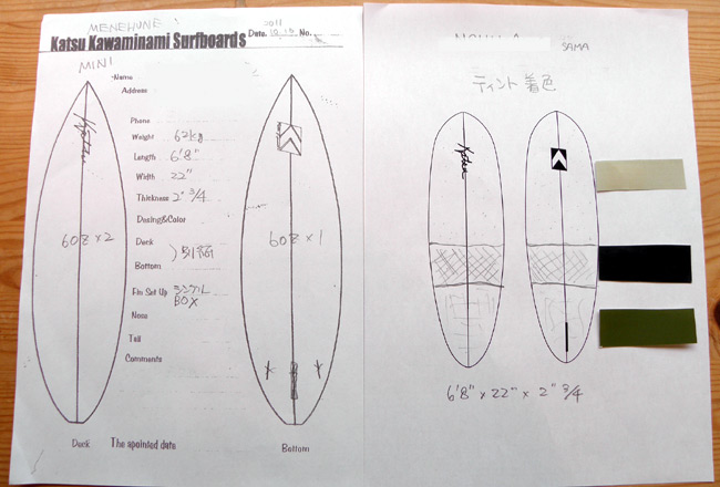 写真ではカラーチップの色はあんまり分かりませんが、カーキ、ダークグリーン、オリーブの三色ティントで塗り分けます。カラーもばっちりです。楽しみにしていてください。シングルフィンのMINIいいですよ~。シェイプが出来上がった写真送りまーす。