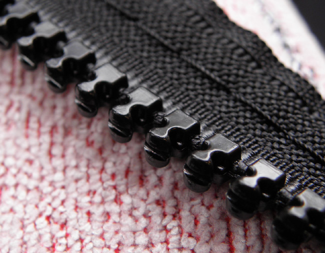 ファスナーの凸部の先端をよーく見てください。細い切れ目が入っています。ファスナーを閉めるとこの部分のへこみがファスナーの凹部にあるパーツ(拡大してよく見ると分かります)と噛みあって、海水の浸入を減らしてくれます。