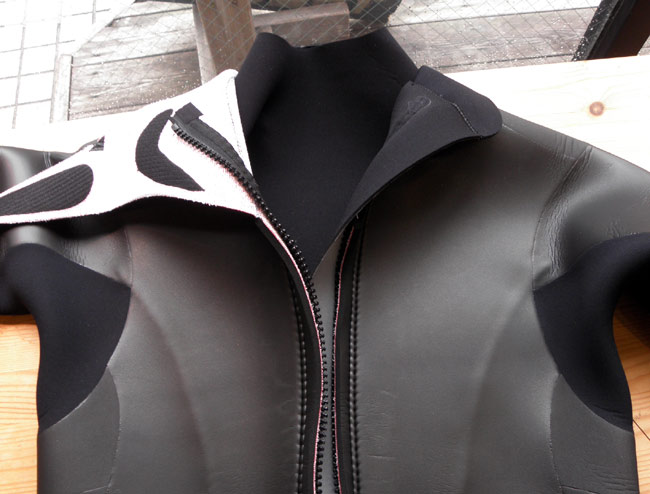 インナーネックがバックジップモデルにもジッパーレスモデルにも標準装備されています。スーツの中へ入ってきた水はここで止まって、ファスナーの下部にあるドレインホールから外部へと排出されるしくみです。
