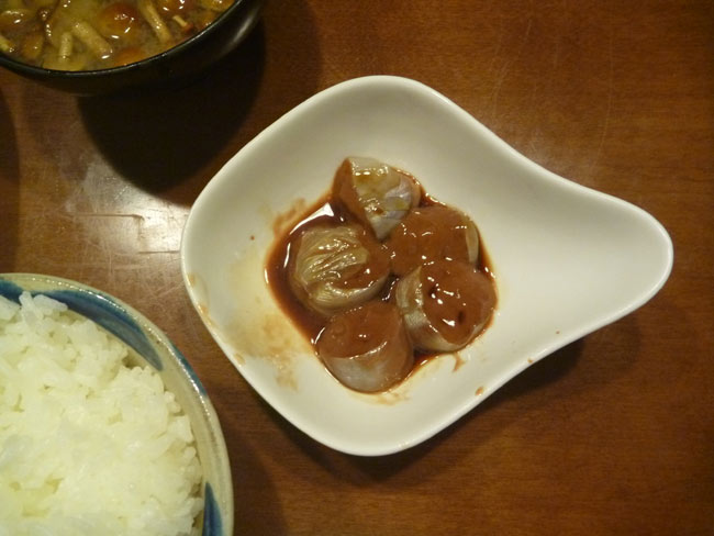 イカの肝の塩辛です。イカの塩辛を作るときにイカの身と肝をつぶして醤油やらで味付けして作りますがこれは肝だけの塩辛です。作り方は簡単。刺身用のイカの肝をきれいに取り出して塩をぱらりと振って冷蔵庫に一晩おいとくだけです。輪切りにして、醤油タラリでいただきます。ご飯と酒がすすみすぎます。