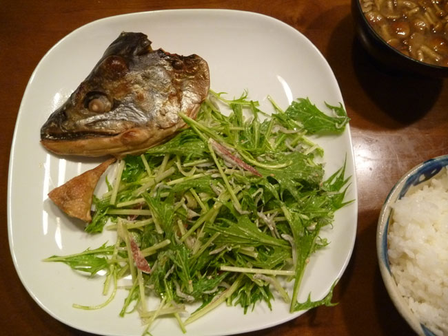 そして晩ご飯。すごい盛り付けです。何やら恨めしそうな顔で見つめられていますが、美味しくいただきました。鯛のお頭焼きはよくやりますが鮭は初めて。鮭の頭は鯛と違って、お肉少ないですね。