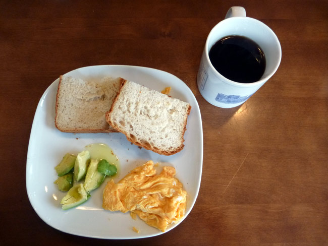 つけあわせはアボカドにスクランブルエッグ。オリーブオイルをかけて食べると小麦の味がしっかりします。