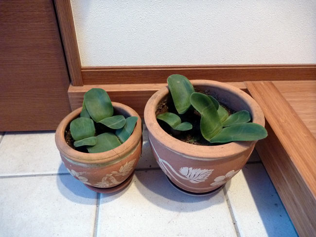 かわいがっているマユハケオモトの鉢を洗って泥を落として家の中に避寒です。春先に根っこが半分以上腐ってしまってどうなるかと心配していたのですが、無事復活してくれました。植物も動物と同じで愛情を注げば応えてくれます。葉っぱの形や妙な形の花がかわいいやつです。