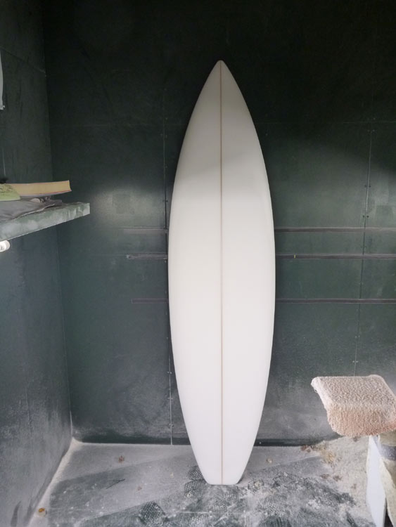 そして、BUNさんオーダーの、6’2”のスペシャルシェイプが完成しました。こうやってみるとちょっとミニガンチックでカッコイイです。ロッカーは抑え目で例のボンザーに負けないスピードで滑ってくれるはずです。