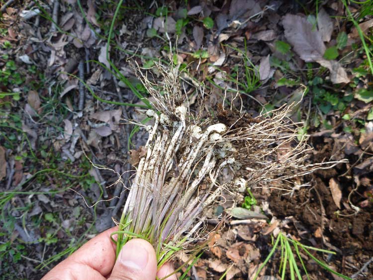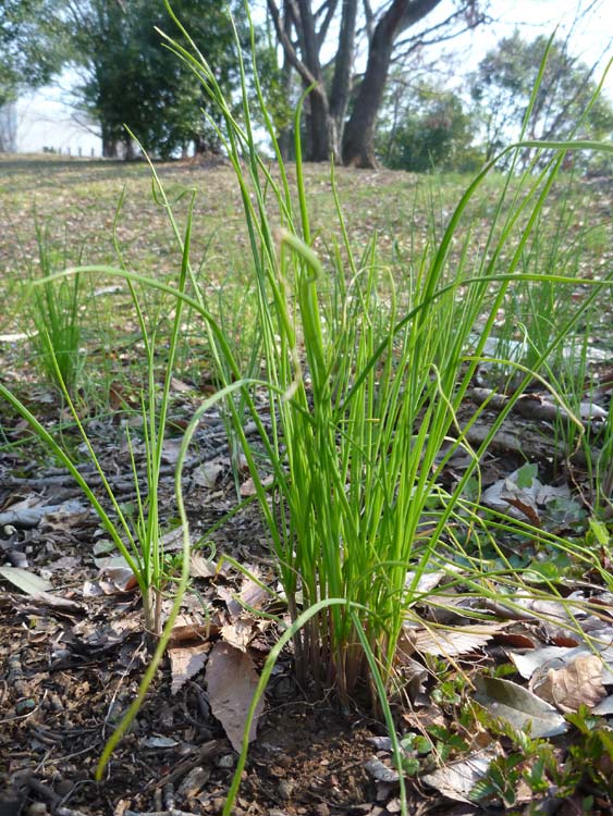 これがノビル。細長い葉は平たくなくて丸い断面をしていて、根っこの部分がちいさなネギみたいなので見分けがつきます。