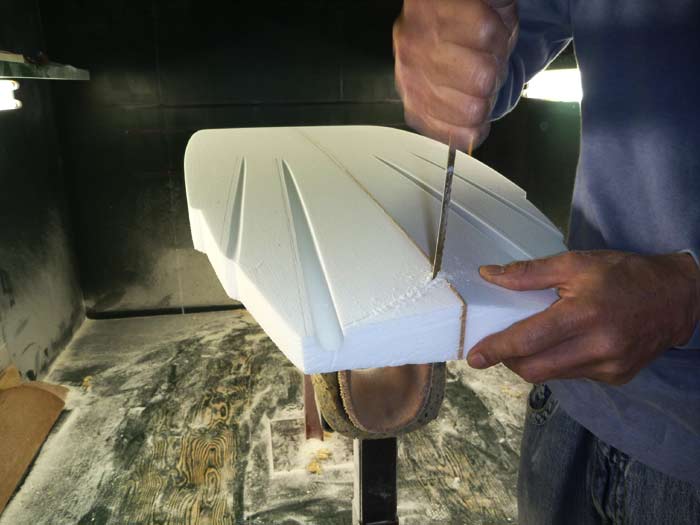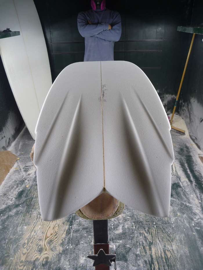先週書いたアウトラインの写真とくらべるとブランクスが変わっているのがわかると思います。ロッカーを変えてシングルフィンらしいロッカーの流れになりました。