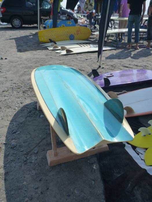 勝手にバレルコンケーブと命名しました。強いVEEボトムに樽(バレル)みたいな丸く深いコンケーブが掘ってあります。フィッシュ・フライには妙なボード、奇をてらったような変わったボードもたくさん並んでいますが、こういう変わり方は正統派の変わり方だと思いました。乗ってみたかったです。