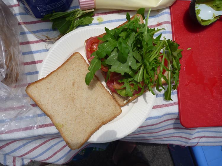 今年のランチタイムはサンドウィッチ。アボカド、トマト、家でカリカリに焼いてきたベーコンに庭から引っこ抜いてきたルッコラをたっぷり挟んでいただきます。