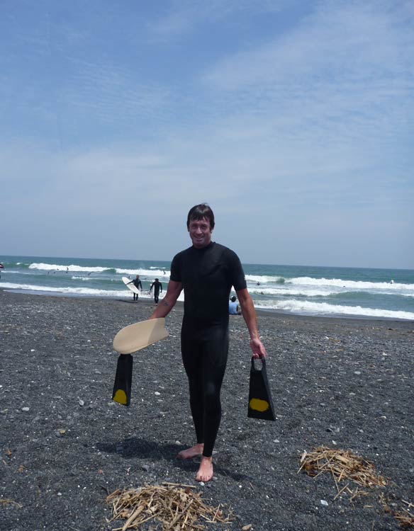 クリスはボディ・サーフィンがお気に入り?一緒にやろうと誘われましたが、ちょうど昼メシの準備中だったので、ランチタイムですとお断り。しばらくして「ハングリー!」と上がってきました。ウェットスーツはもちろんAXXE CLASSICです。