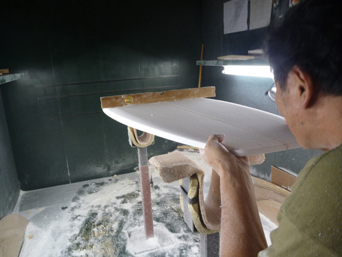 いまさらですがカツカワミナミサーフボードは100パーセントハンドシェイプです。ゴツゴツしたブランクスの表面を削って滑らかにして、スケールで各ポイントのサイズを決め、テンプレットをあててアウトラインを引いていきます。
