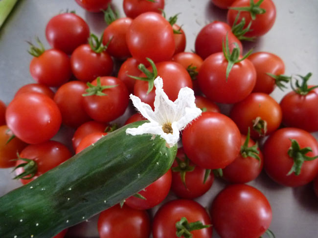 写真解説 上:キュウリを収穫したら花がまだきれいに咲いていました。 下:ゴーヤが熟れてきれいなオレンジ色に。ゴーヤチャンプルには出来ませんが、中の真っ赤な種をしゃぶるとほんのり甘くて和みます。