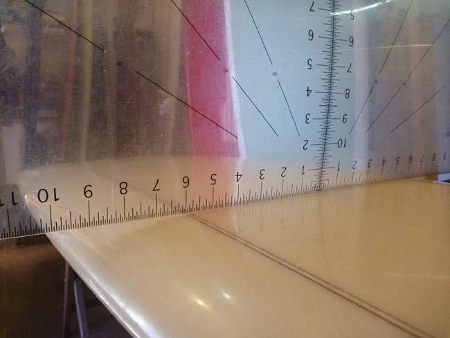 わかるかな~、写真わかりにくいですが人が乗ってボードをコントロールすると思われるあたりのボトムの真ん中あたりにフラットな面がとられています。このボードは2ストリンガーですが、ちょうど二本のストリンガーの間がフラットになっているイメージ。