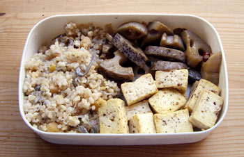 今日の昼飯。レンコンのキンピラに豆腐のソテー、それから新潟のSさんにいただいた、コシヒカリ?ひとめぼれ?(なんでしたっけ)の玄米とチリメン。新米の取れたてをわざわざ持ってきていただいたのですが、これムチャクチャうまいです。お米のおかげで粗末なおかずですが豊かな気持ち。ありがとうございました。この場を借りてお礼します。