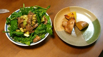 よく登場するアヴォカトとレバーのサラダ。寒ちぢみホウレンソウのサラダの上にトッピング。寒ちぢみは寒さにあたってシワシワになったホウレンソウですが、肉厚で甘みが増していて、鍋やおひたしにしても普通のホウレンソウと一味違います。ホウレンソウにはシュウ酸が多いので生で食べすぎるのはあんまり良くないのですが、うまいのでつい…。(水溶性のシュウ酸なので、おひたしにすればOKです。)