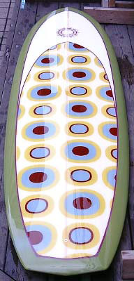 長さは同じ6.10。カラーリングがかわいい。探してきたクロスをラミネートして、ピグメントと組み合わせています。フィンもテンプレットから作ったオリジナルのフレックスです(長!)