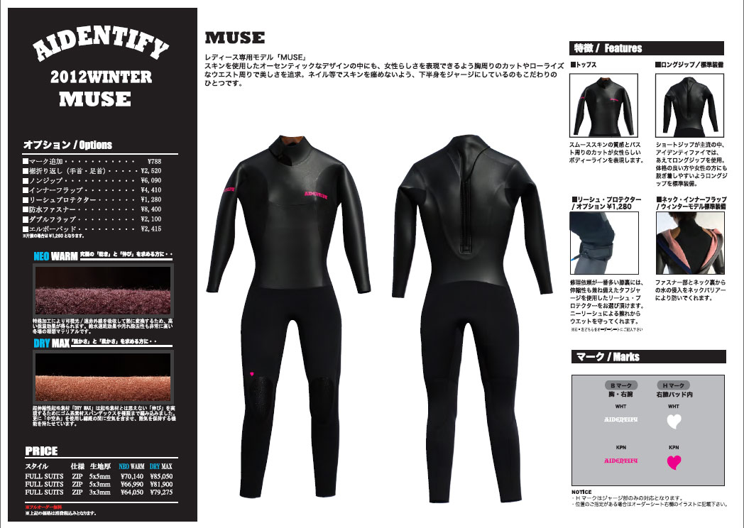 レディス用のMUSEもカワイイです。オーダーフェアの特別企画品もご用意しています。AIDENTIFYウェットスーツよろしくお願いします。