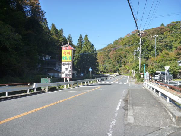 ゆっくりゆっくり走っていくと、陣馬温泉の看板が見えてきます。これが目印。ここを右手に折れます。ここまで約15分、距離にして2キロちょっと。陣馬温泉、ひなびた感じでいい雰囲気ですよ。