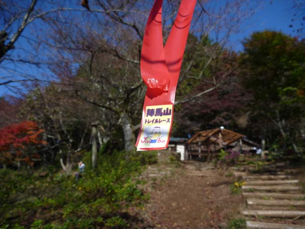 登ること約10分。明王峠に到着です。陣馬山レースのコース標識がぶら下がっています。ここもレースのコースです。ボケていますが茶屋とトイレがあります。