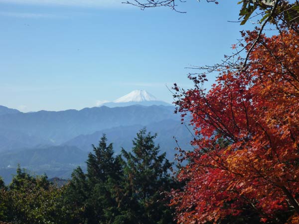 明王峠からの眺め。紅葉と富士山。とても日本的な風景です。ここで分岐。左へ行くと陣馬山、右へ行くと高尾方面へ行くことができます。標識に従っていけばOKです。