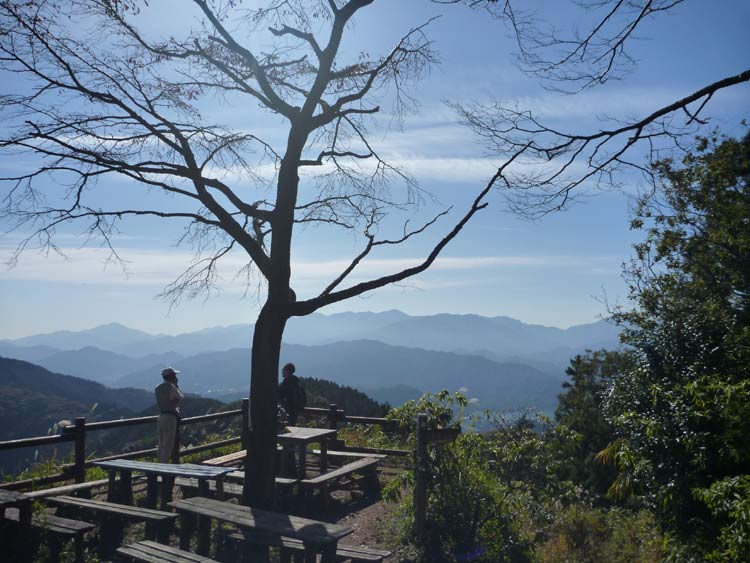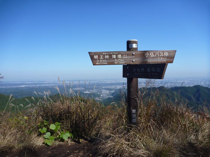 明王峠から約40分。景信山に到着。ここは眺めがいいのでまかずに登ってみました。スタートしてからちょうど2時間が経過しています。標識の向こうには東京が一望できます。スカイツリーも見えています。