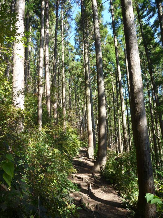 ちょうど1時間くらい登っていくとトレイルへの入り口があります。登り口からここまで約7キロ(トータルで約9キロ)。レースのときより全然ゆっくりのペースです。林道の左右にトレイルの入り口がありますが、標識に明王峠と書いてある左側のトレイルを登っていきます。右に行くとまた藤野方面に戻ることができます。