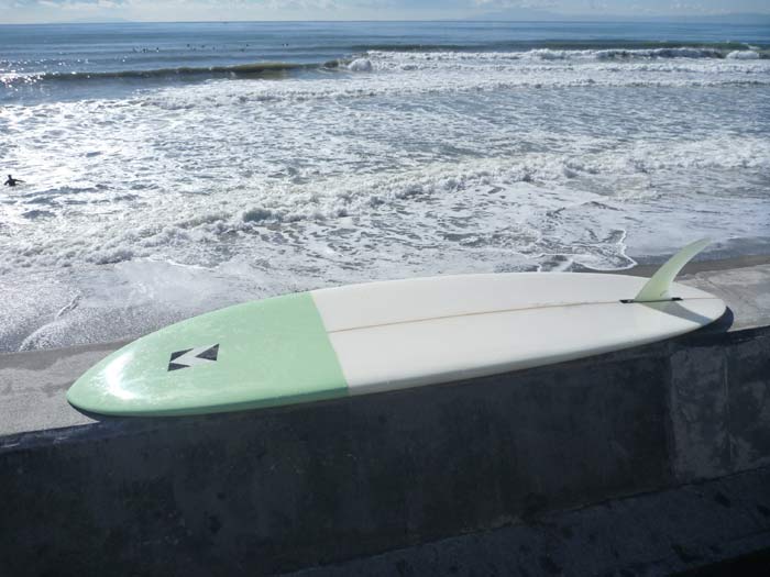 知り合いが前回の台風でカリフォルニアのある超レジェンド級シェイパーが削った、トライフィンの同じくらいのレングスのボードと乗り比べてみたら、プリモのシングルフィンの方がよく動いたそうです。