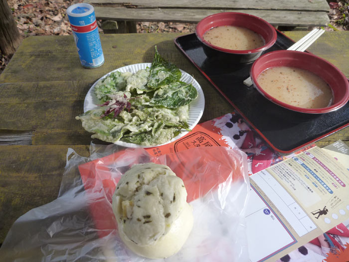 それでまたまた山菜のテンプラ。モミジのテンプラが見えてますが美味しかったです。今日はビールは無し(寒いし)で、なめこ汁と酒まんじゅう。
