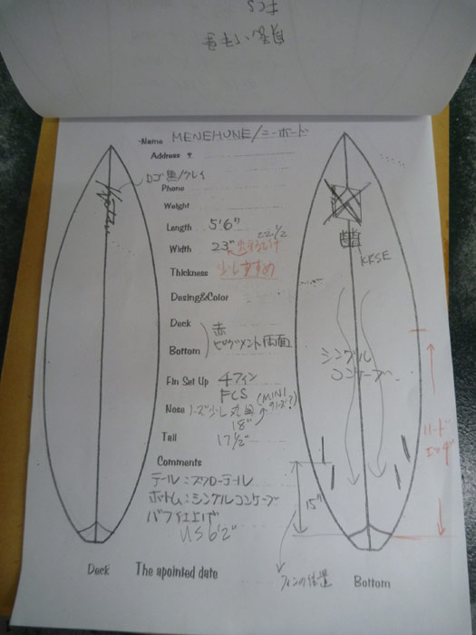 新しいニーボード、長さは今のと同じ5.6です。フィンはクアッド。スワローテールで今回はウィングは入れません。ボトムはシングルコンケーブでレールにハードエッジをボードの半分くらいまでパキッと入れます。