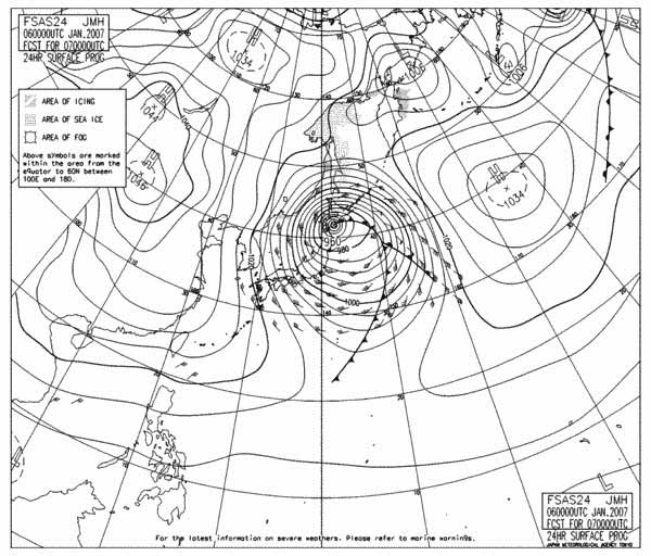 明日7日、午前9時の予想天気図。現在、日本海側と太平洋岸を通過中の低気圧がくっついて、こんな等圧線グルグルの状況に。(天気図の読み方ワンポイントアドバイスその1:等圧線が密集しているということはその地域の気圧の差が激しいということ=風が強く吹いているということ。風向きは低気圧と前線、高気圧の位置で予想可能。これはまた後ほど)
