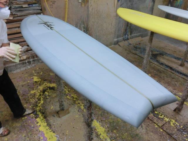 ここからデッキにもう一層クロスを乗せて、都合3層(通常は2層。今回はエクストラクロスを1層追加してます)でデッキをラミネートしてサンディング、フィンをグラスオン、ロービングやエッジを付けてからトップコートをかけて仕上げです。仕上げは艶消しのサンディングフィニッシュ(ピグメントカラーでは、エアブラシやクリアのショートボードのサンディングフィニッシュとはちょっと違う工程になります)で完成です。