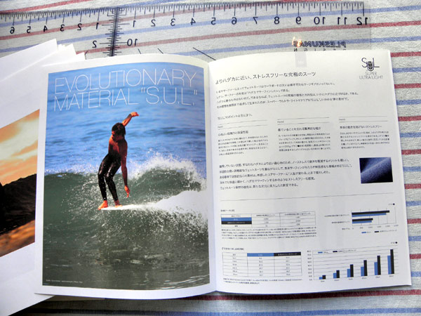 左のページには、このSULという素材が「これであなたのサーフィンライフ変わります」と言ってもいいくらいの革新的な素材ですよ、ということがいろんなデータをもとに説明されています。