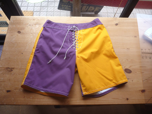 さてNALUTOに加えてもうひとつのカスタムサーフショーツ、パンクマウスパンツが出来上がってきました。フロントのレースアップにパープルとイエローのレイカーズカラーがクラシックです。