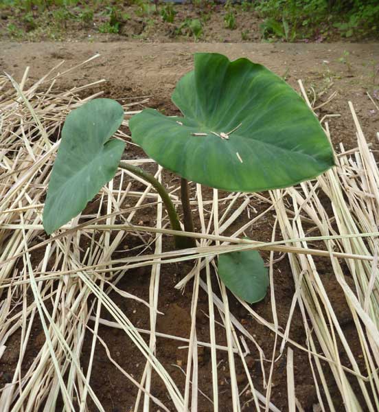 植えたのは八つ頭です。イモを育てるのは初めてです。近所の農家の真似をして藁を敷いてみました。もう少し敷いた方がいいかな?