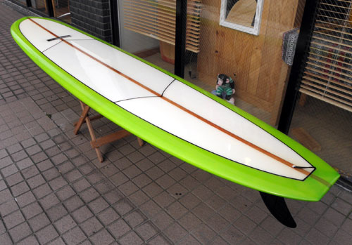長さは、9.4。ハーフインチのレッドウッドストリンガーにピンラインでアクセントをつけたニーパッチとこだわった作りです。フィンはBOXでピヴォットタイプのフィンが付属します。カラーはきれいなライムグリーンティント。