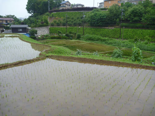 田んぼもまだ残っています。ホタルの川は田んぼと上の住宅地の間の谷間を流れています。川に沿って走りながら、あたりの地形をみていくと昔はこの棚田がもっと続いていたんだろうなあと想像できます。
