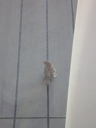 まだうまく飛べないのか、弱っているのかガラス越しに近づいても逃げずにじっとしています。さっきのスズメたちはこの子スズメを心配して集まっていたみたいです。