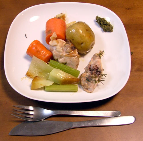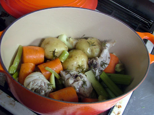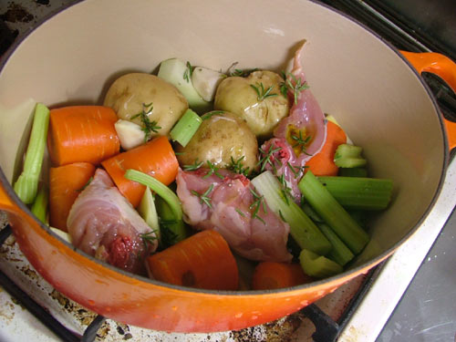 厚手のナベを探してきて、食材をならべる。ここに入っているのは、鶏肉、ジャガイモ(皮付き丸のまま)、人参、セロリなんぞをブツブツ切ってならべる。家に帰る途中で採取(失敬)してきたローズマリーをちらしてオリーブオイルを回しかける。