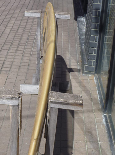 大潮の上げに乗ってたまーにやってくるコシくらいの波にテイクオフして、横に走らせるとかなり速いです。ボードの真ん中あたりでテーパーレールと丸いボトムを意識しながらコントロールしてあげると小さなフェイスでのダウンザラインも楽しいボードです。カットバックはスピードとボードの重量があるので、腰を入れて捻る動きはちょっと恐くて、テールを踏んでストール。ユニークなボードです。
