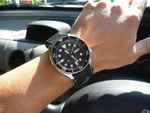 ナイロン製でオリジナルのベルトよりもコンパクトですが、ダイバーズのボリュームにしっくりきていい感じです。服の袖口も気になりません。