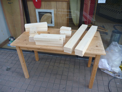 近所のホームセンターで2x4材を買ってきて、のこぎりで切ります。