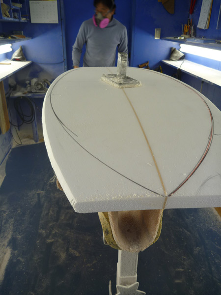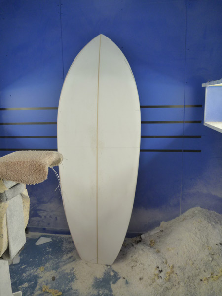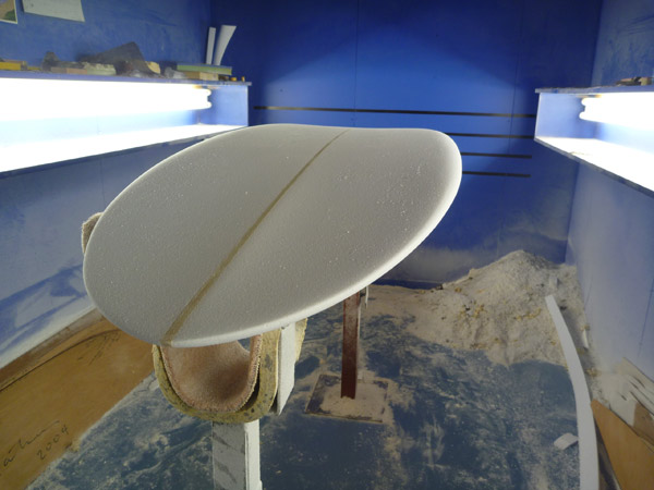 プリモのボトム。長さは違っても10フィートも6フィート8インチも同じシェイプ。プリモの調子よさの秘密はこのボトムにあります。カツさんのシェイプ技術の高さが伝わってくる玄妙な曲面です。