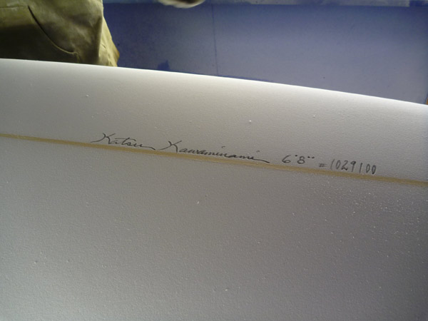 6’8”のプリモのシェイプが出来上がりました!プリモは8フィート → 7フィート3インチ → 10フィートと乗ってきて、これで四本目です。この6’8”はカツさんのパーソナルプリモの6’9”をお借りして乗ってみて一発で気に入ってしまったので、1インチだけ短くしてシェイプしてもらいました。