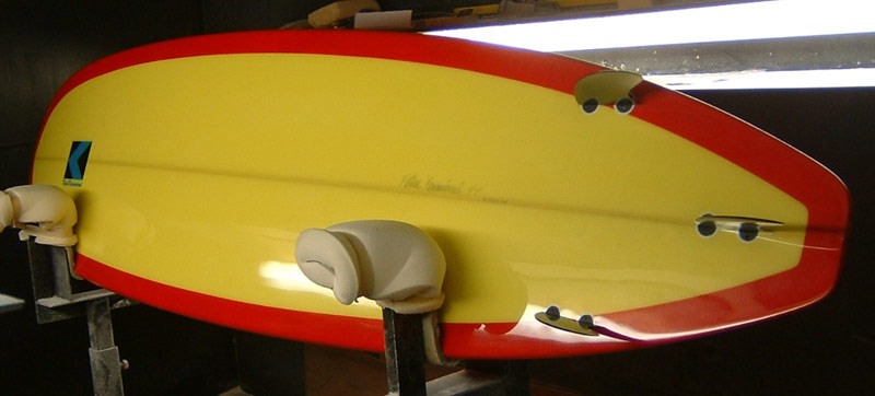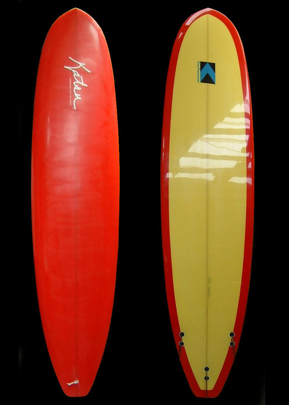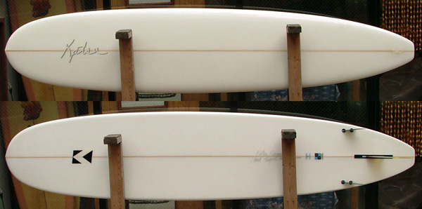 上のボードに乗っているカツさんです。長さは7’7”。
