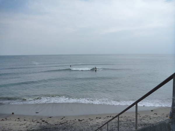 午後からは波が上がりそうだったので海へ。弁当を食いつつ待ってみると、3時過ぎくらいからハラ~ムネくらいのうねりが入り始めました。これは入りはじめ。